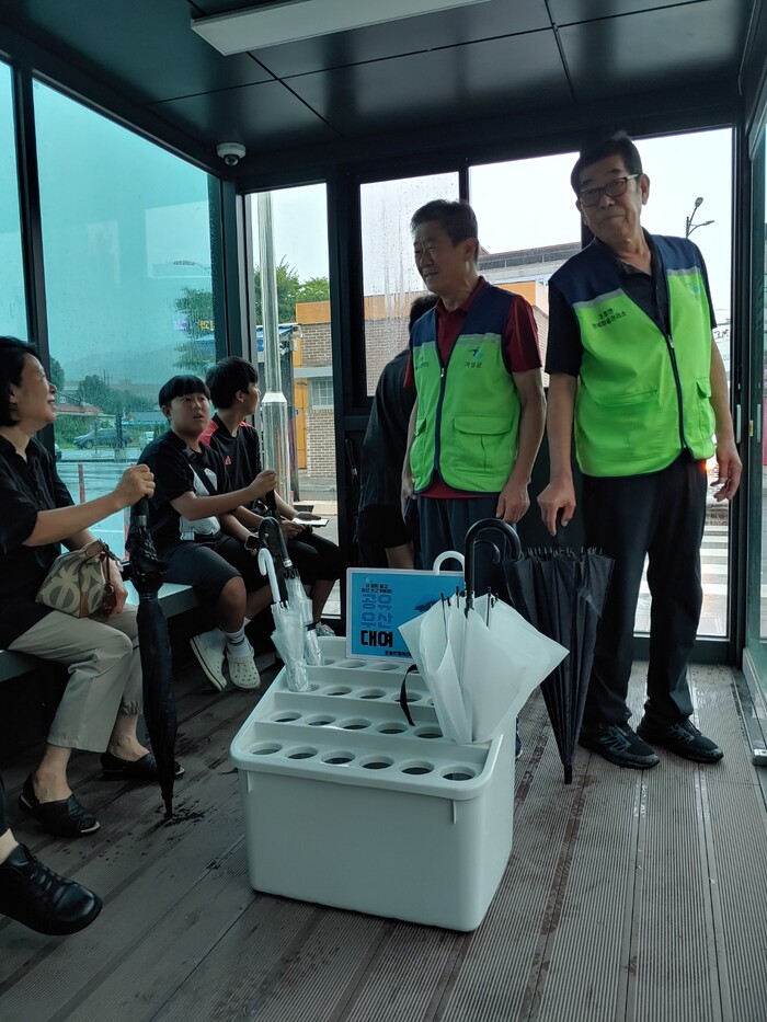경기 가평군 조종면 행복마을관리소는 지난달 중순부터 지역 주민들의 편의를 위해 공유 우산 서비스를 운영하고 있다. 공유 우산은 유동 인구가 많은 조종면 버스정류장과 행정복지센터에 각각 비치돼 있다. 사진은 최근 조종면 버스정류장에서 공유 우산 서비스가 운영되고 있는 모습.(사진=가평군청 제공)