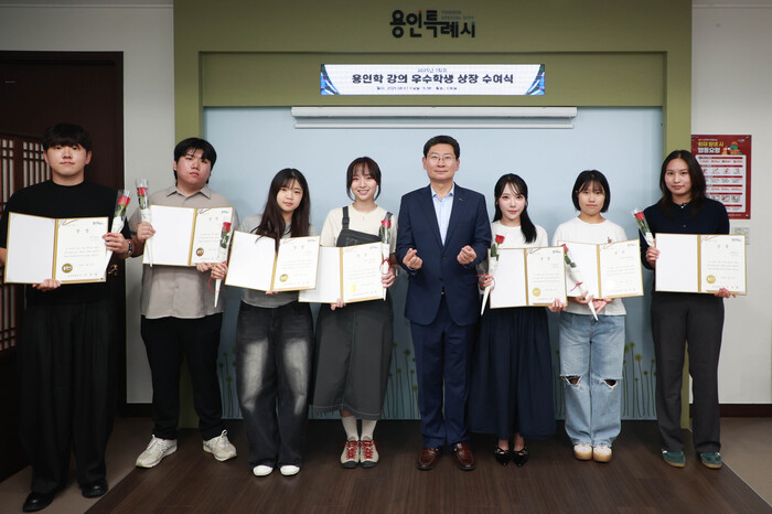 [용인=오왕석 기자] 이상일 용인특례시장이 27일 시장실에서 지역 내 대학에 교양 과목으로 개설된 ‘용인학 강좌 2025년 1학기 우수 학생 8명에게 상장을 수여했다.