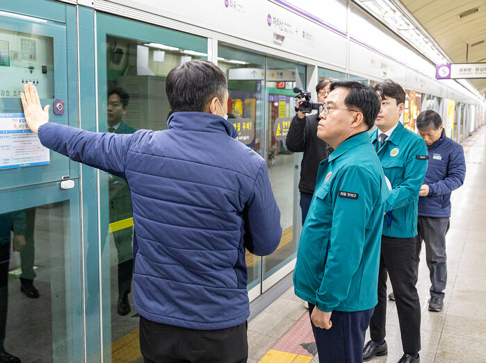 진교훈 서울 강서구청장이 지난 4일 지하철 5호선 까치산역을 찾아 승강장 안전문 비상제어장치 정상 작동 여부 등 시설물 안전관리 사항을 점검했다. 사진은 진 구청장이 승강장 안전문 작동 여부를 확인하는 모습. (사진=강서구청 제공)