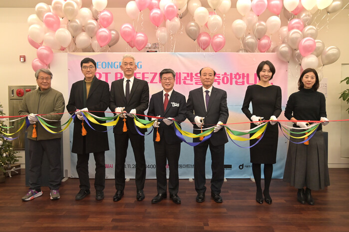 | ▲ 명동아트브리즈 개관을 축하하며 김길성 중구청장과 내빈들이 테이프 커팅을 하고 있다.(왼쪽부터) 홍성준 중구통장협의회 회장, 조세현 중구문화재단 사장, 이중호 르메르디앙앤목시 서울명동 호텔 총지배인, 김길성 중구청장, 남월진 중구문화원장, 이효진 리버이앤엠대표, 이현정 갤러리플래닛 대표의 모습.(사진=중구청 제공) |