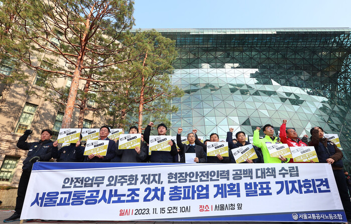 민주노총 공공운수노조 산하 서울교통공사노조는 15일 오전 서울시청 앞에서 기자회견을 열어 파업 계획을 밝혔다.