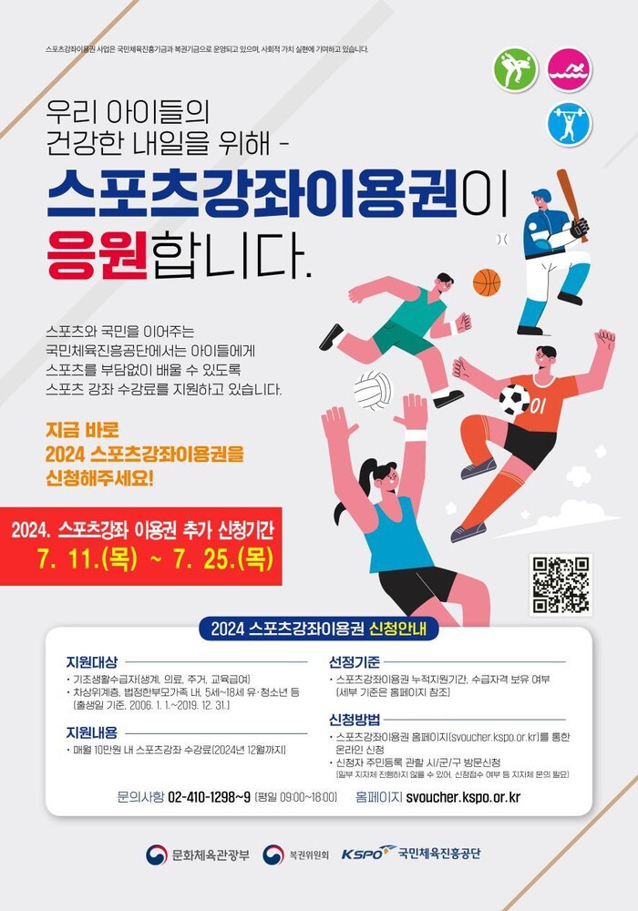 스포츠강좌이용권은 스포츠활동에 대한 평등한 기회를 제공하고 저소득층 아동과 청소년의 건강증진을 도모하기 위한 것으로 대상자에게 스포츠강좌 수강료를 지원하는 사업이다.