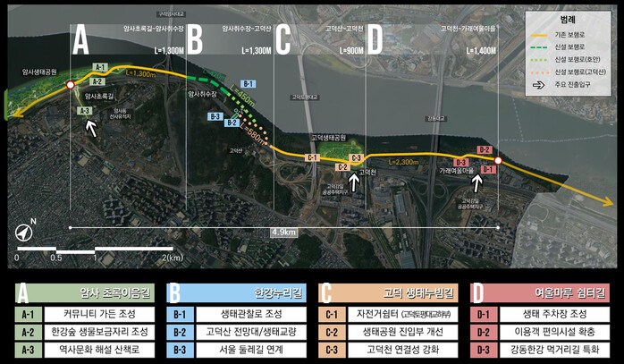또한, 구는 암사생태공원에서 가래여울마을까지 4개 구간(A~D 구간)으로 나눠, 각 구간의 특성과 강점을 살린 전략으로 12개 실행 과제를 수립했다.