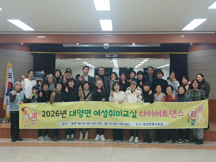 박수영 대양면장은 “다이어트댄스 교실이 주민들의 건강한 생활에 도움이 되는 것은 물론, 마을 간 소통과 화합을 넓히는 계기가 되길 바란다”며 “앞으로도 주민 수요에 맞는 다양한 취미·여가 프로그램을 지속적으로 운영해 나가겠다”고 말했다.