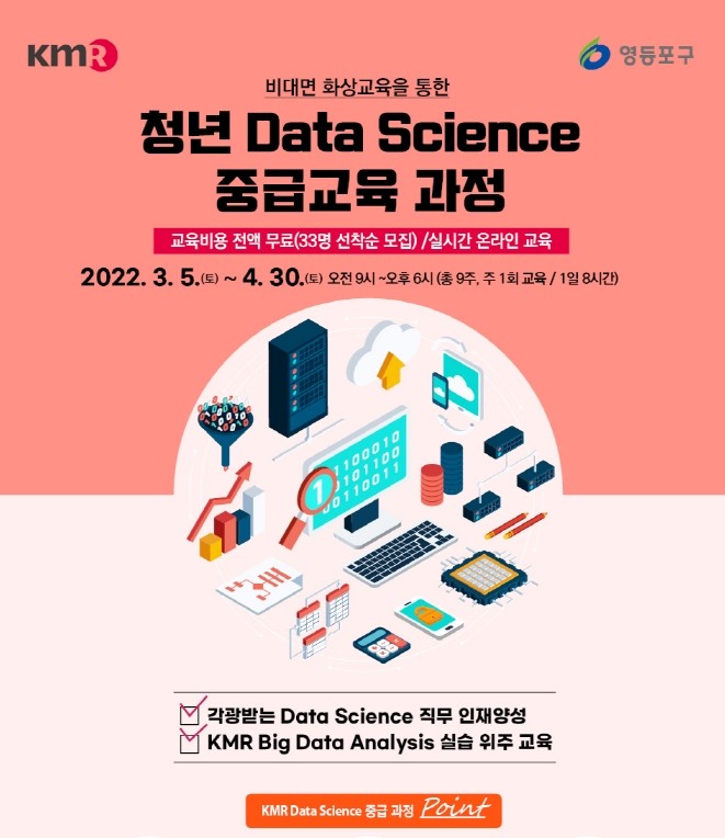 빅데이터 분석 초급 수준 이상(Pathon 기초학습 수행자)의 기본 지식을 갖춘 만 19세 이상~39세 미만 청년이면 참여 가능하다. 신청은 온라인 구글폼을 통해 2월 23일까지 선착순으로 받는다. 모집 인원은 30명이고, 영등포구민 또는 영등포구 교육 수료생을 우선 선발할 예정이다.