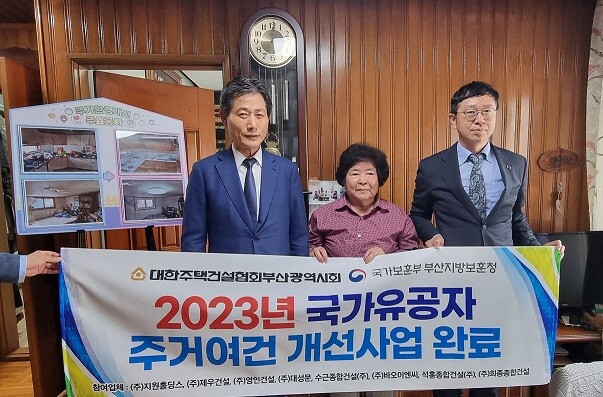 ‘국가유공자 주거여건개선사업’은 사회적 지원이 필요한 국가유공자 가구를 부산지방보훈청으로부터 추천받아 대한주택건설협회 부산광역시회 회원사가 전액 자비로 주택을 개보수하는 민간차원의 보훈사업으로, 올해는 ㈜지원홀딩스(회장 박재복), ㈜제우건설(회장 구제운), ㈜영인건설(회장 정현석), ㈜대성문(회장 채창호), 수근종합건설(주)(회장 성석동), ㈜바오이엔씨(회장 정철수), 석홍종합건설(주)(회장 홍선표), ㈜희종종합건설(회장 이영종)로 총 8개 업체에서 참여하였다.
