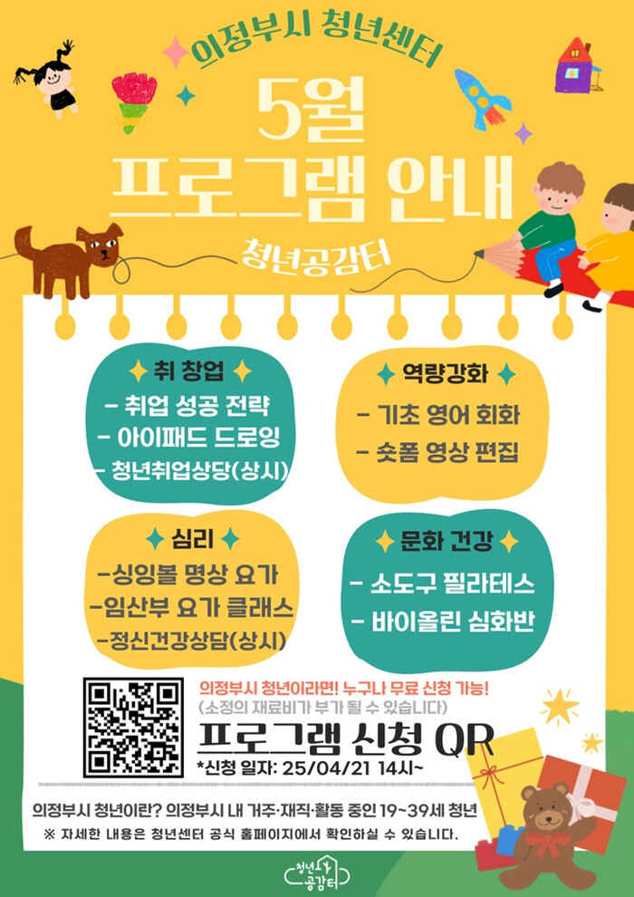 [시민일보 = 민장홍 기자] 경기 의정부시 청년센터 청년공감터가 24일부터 5월 가정의 달 프로그램에 참여할 청년을 모집한다.