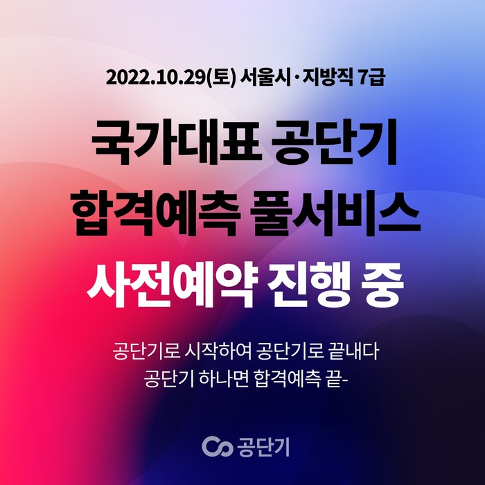 [시민일보 = 여영준 기자] 에스티유니타스의 공무원 시험 전문 브랜드 ‘공단기’는 오는 29일 시행되는 서울시·지방직 7급 공무원 시험을 앞두고, 시험 채점 및 합격 가능성을 예측하는 ‘공단기 합격예측 풀서비스’의 예약 페이지를 19일 오픈한다고 14일 밝혔다.