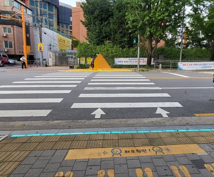 ‘바닥신호등’은 횡단보도 바닥에 보행신호를 연동한 LED 신호를 표출하며, ‘음성안내 보조장치’는 보행 적신호에 차도로 진입한 보행자에게 위험을 경고하는 등의 음성 안내를 제공한다.