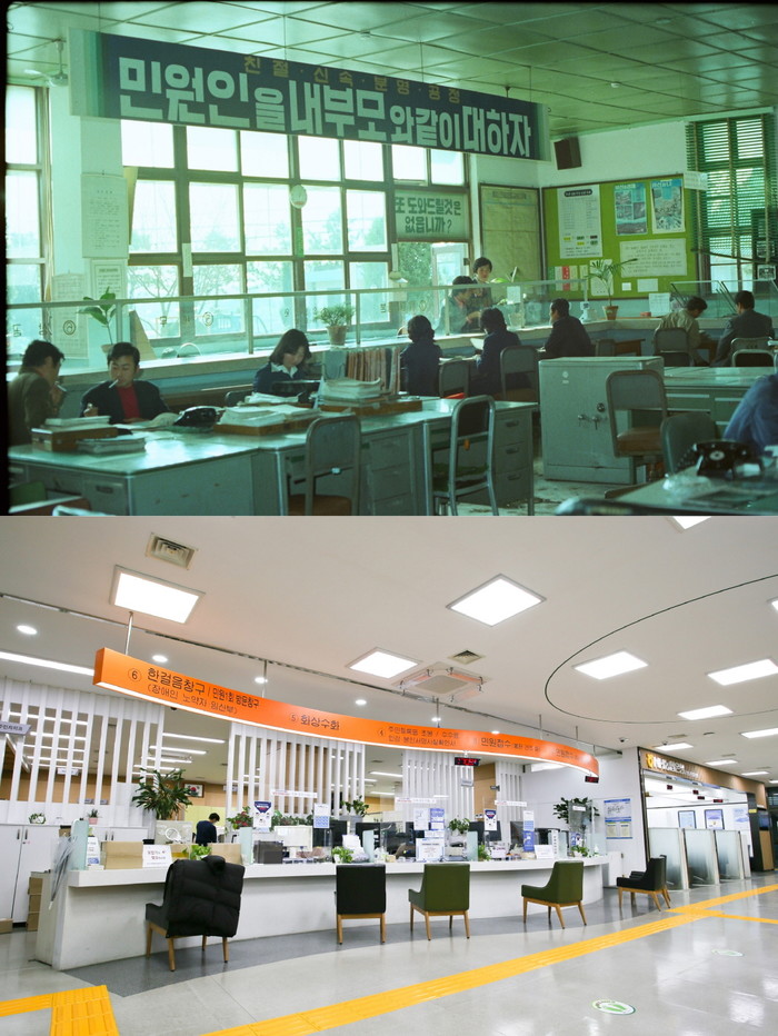 | ▲ 사진제공=(위)고양시청/1970년대 고양군청 민원실 (아래) 현재의 고양시청 민원실 |
