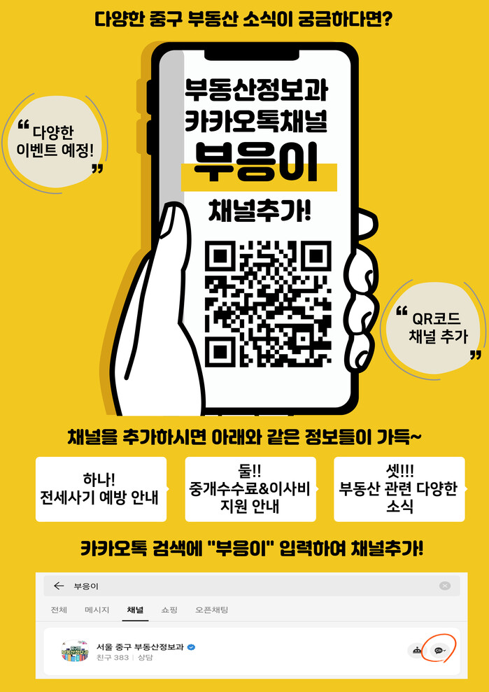 부응이를 활용하기 위해서는 카카오톡 검색창에 ‘서울 중구 부동산정보과’ 또는 ‘부응이’를 입력한 후 친구 추가를 하면 된다. 채널 가입자에겐 부동산 관련 소식도 전해준다.
