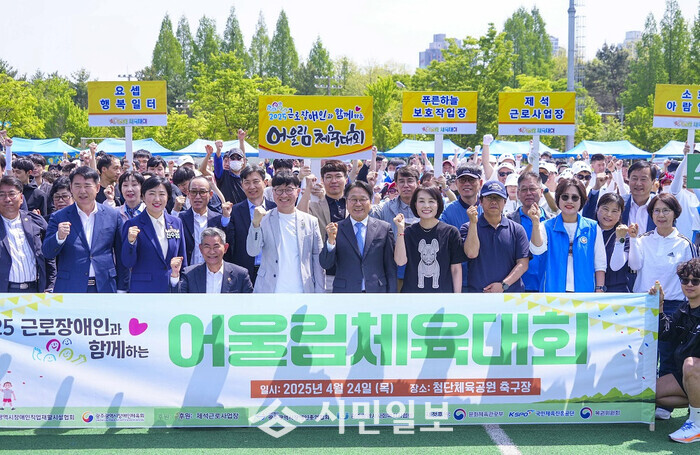 [광주=정찬남 기자] 강기정 광주광역시장(앞줄 왼 쪽부터 여섯 번째)이 24일 오전 북구 첨단체육공원 축구장에서 열린 '근로장애인과 함께하는 어울림 체육대회'에서 참석자들과 기념촬영을 하고 있다./광주광역시 제공