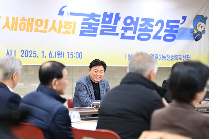 조용익 경기 부천시장이 새해의 힘찬 시작을 시민과 함께하고자 6일 원종1·2동을 시작으로 37개 동 새해인사회에 나섰다. 사진은 조 시장이 원종2동 행정복지센터를 방문해 시민들과 새해덕담을 나누고 있는 모습. (사진=부천시청 제공)