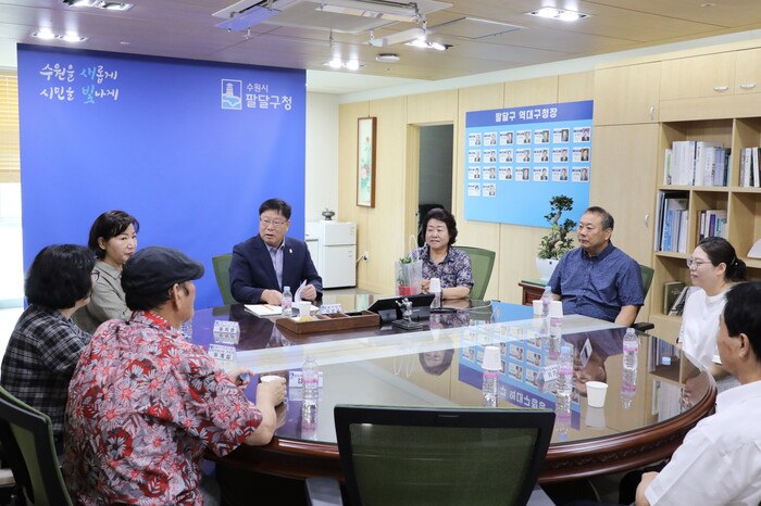 경기 수원시 팔달구는 30일 팔달구 통장협의회와 소통 간담회를 개최했으며, 임기가 만료된 진복례 매산동 통장협의회장에게 그간 노고에 고마운 마음을 담은 감사패를 전달했다. 사진은 간담회에서 이상균 구청장(왼쪽 네 번째)이 이야기를 나누고 있는 모습. (사진=팔달구청 제공)