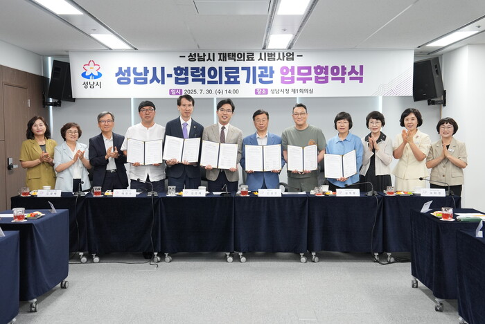 시는 이날 오후 2시 시청 4층 제1회의실에서 성남시의사회, 집으로의원, 연세가정의원, 서울가정의원, 새한베스트의원, 연세생명나무내과의원과 ‘재택의료사업 추진을 위한 업무협약’을 했다.