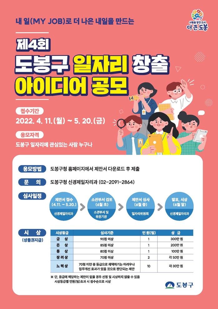 [시민일보 = 박준우 기자] 도봉구(구청장 이동진)가 일자리 발굴을 위해 '제4회 도봉구 일자리 창출 아이디어 공모전'을 실시한다.