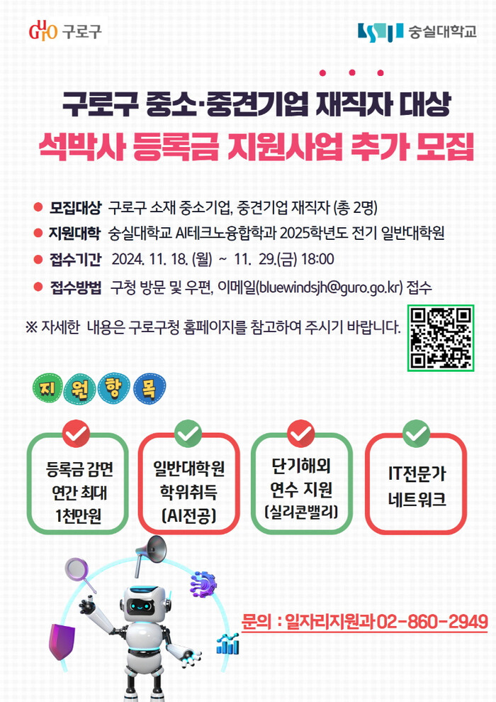 [시민일보 = 박소진 기자] 서울 구로구(구청장권한대행 엄의식)가 오는 29일까지 지역지능화혁신인재양성사업의 일환인 ‘숭실대 AI테크노융합학과 석·박사 과정 장학생’을 추가 모집한다.