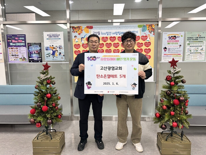 경기 의정부시 고산동 주민센터가 최근 고산광염교회로부터 소외된 이웃을 위한 탄소온열매트 5개(52만원 상당)를 기탁받았다. 사진은 기탁식에서 관계자들이 기념촬영을 하는 모습. (사진=의정부시청 제공)
