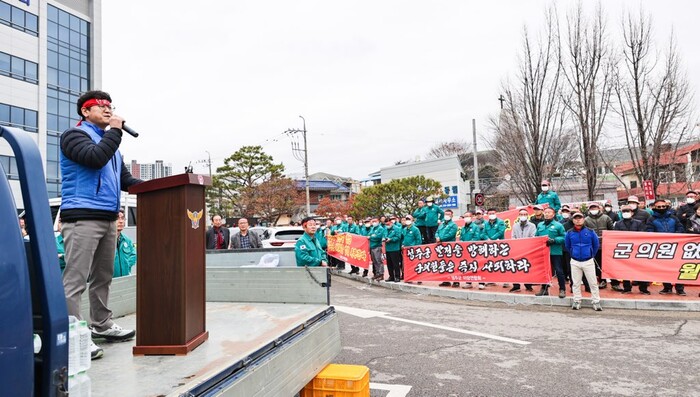 앞서 지난 11일에는 군의회를 비판하는 성명서를 발표하였고 항의성 근조화환을 의회 입구에 설치하였다.
