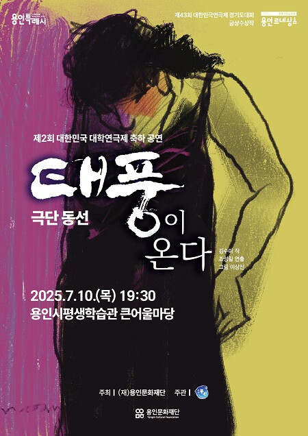 [용인=오왕석 기자] 용인문화재단(이사장 이상일)은 ‘제2회 대한민국 대학연극제’ 축하 공연으로, 극단 ‘동선’의 연극 《태풍이 온다》를 오는 7월 10일(목) 오후 7시 30분, 용인시평생학습관 큰어울마당에서 선보인다.