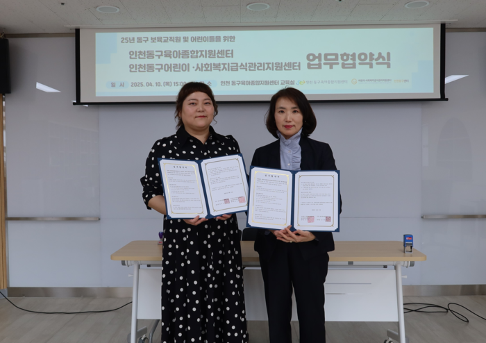 [인천=문찬식 기자] 인천 동구육아종합지원센터가 동구 어린이ㆍ사회복지급식관리지원센터와 최근 어린이 급식과 관련한 다양한 서비스 제공을 위한 업무협약을 체결했다고 24일 밝혔다.