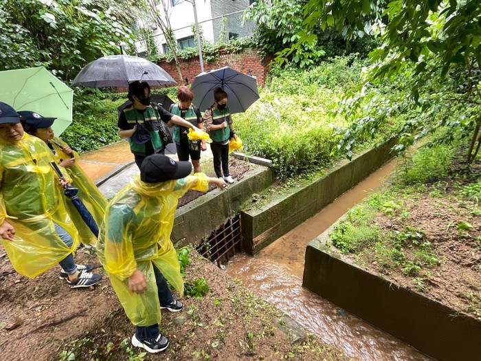 폭우에도 불구하고 20여 명의 여성민방위대원은 불광천 일대, 앵봉산 생태공원, 신사1동 및 덕산중학교 주변을 찾아 두루 살폈다.