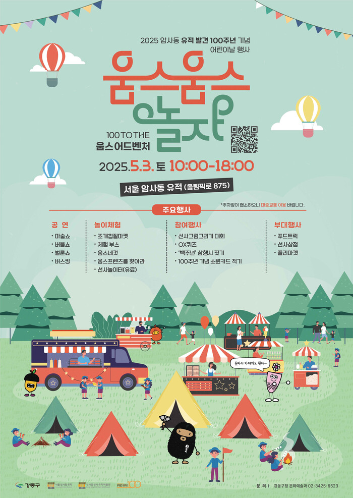 [시민일보 = 이대우 기자] 서울 강동구(구청장 이수희)가 암사동 유적 발견 100주년과 어린이날을 기념해 오는 5월3일, 온 가족이 함께 즐기는 ‘100 TO THE 움스 어드벤처’ 행사를 개최한다.