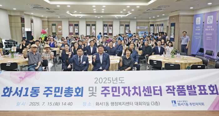 경기 수원시 팔달구 화서1동 주민자치회가 15일 화서1동 행정복지센터 3층에서 ‘2025 화서1동 주민총회 및 주민자치 프로그램 작품발표회’를 함께 열고 주민 100여명과 뜻깊은 시간을 보냈다. 사진은 이상균 구청장 및 참석자들이 기념촬영을 하고 있는 모습. (사진=팔달구청 제공)