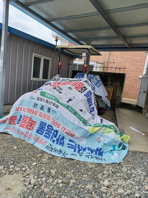 | ▲ 폐현수막을 농기계 덮개로 사용한 모습 |