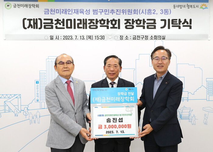 서울 금천구 금천미래장학회가 지난 13일 금천미래인재육성 범구민추진위원회로부터 장학금을 기탁받았다. 이날 범추위 시흥2·3동으로부터 각 장학금 300만원을 전달받았다. 사진은 유성훈 구청장(오른쪽)이 박준식 금천미래장학회 이사장, 시흥2동 송진섭 위원과 기념촬영을 하고 있는 모습. (사진=금천구청 제공)