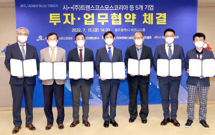 [광주=정찬남 기자] 광주광역시는 15일 시청 비즈니스룸에서 ㈜트랜스코스모스코리아 등 5개 기업과 108억 원 규모의 투자협약을 체결했다.