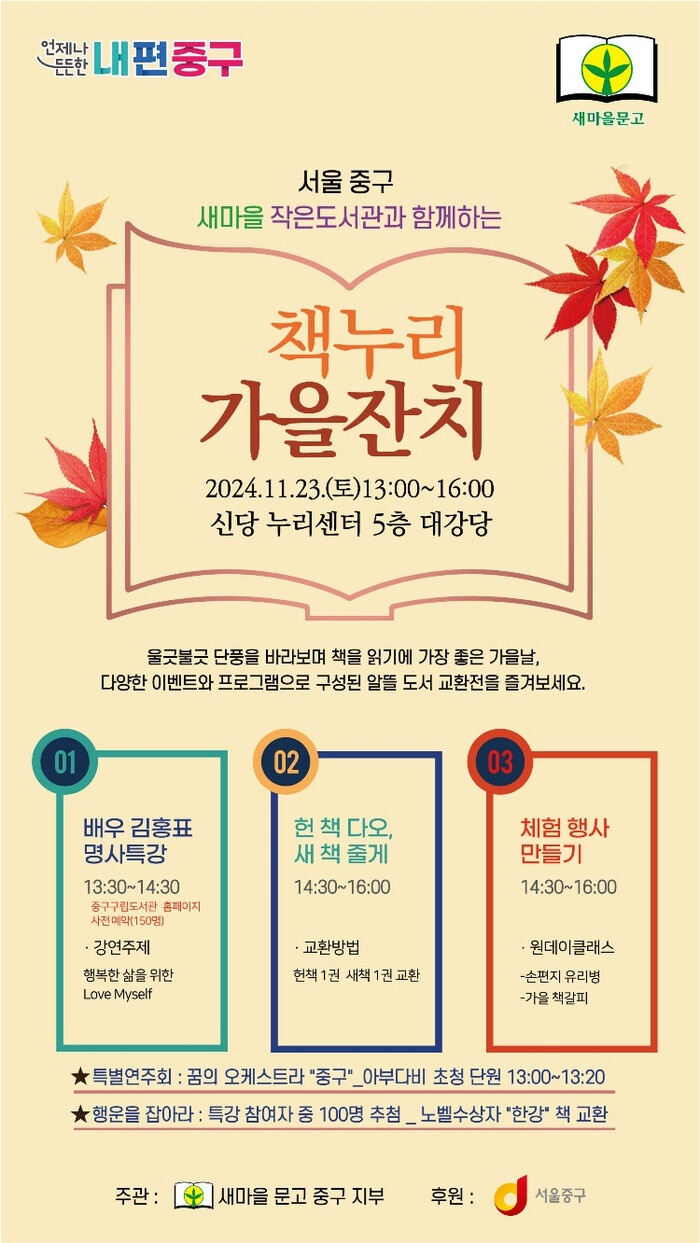 [시민일보 = 여영준 기자] 중구가 새마을 작은도서관과 함께 오는 23일 신당누리센터 대강당과 배움누리방에서 ‘책누리 가을잔치’를 개최한다.