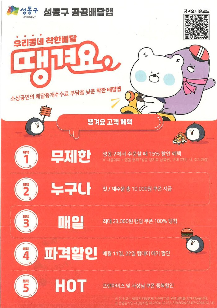 [시민일보 = 이대우 기자] 서울 성동구(구청장 정원오)는 소상공인과 소비자들이 함께 혜택을 받을 수 있는 성동형 상생 공공배달앱 ‘땡겨요’를 운영한다.