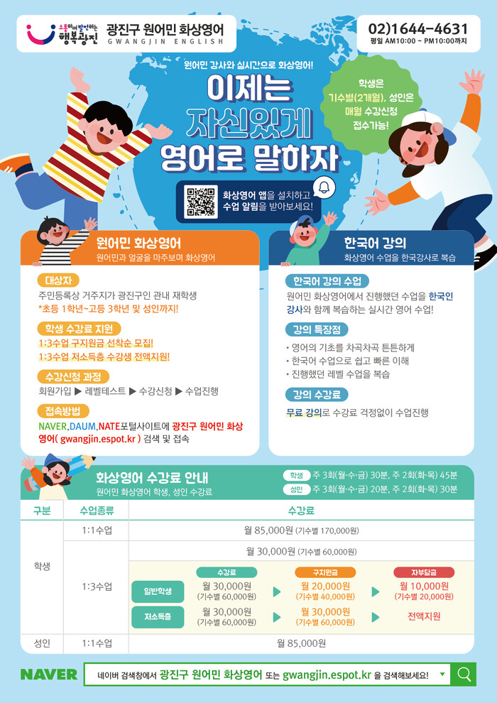 [시민일보 = 여영준 기자] 서울 광진구(구청장 김경호)가 영어 회화를 배우는 데 경제적 부담을 줄이고, 재미와 자신감을 북돋기 위해 ‘원어민 화상영어 학습’을 지원한다.