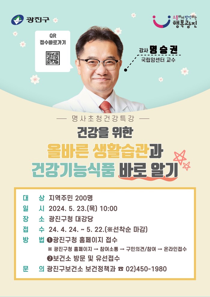 [시민일보 = 여영준 기자] 서울 광진구(구청장 김경호)가 오는 23일, 광진구청 대강당에서 구민 건강 증진을 위한 ‘명사초청 건강특강’을 개최한다.