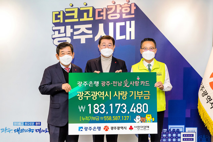 올해로 4년째 ‘광주·전남愛사랑카드’의 고향사랑 기부금을 전달하고 있는 광주은행은 2018년에 1억2천9백만원, 2019년에 2억9천5백만원, 2020년에 2억9천6백만원, 누적 10억3천만원을 광주·전남 사회복지공동모금회에 기부하며 지역밀착경영을 통한 지역사회로의 나눔을 실천하고 있다.