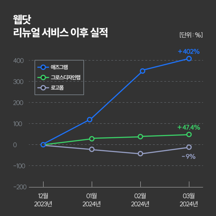 결과는 그로스디자인랩, 애즈그램, 로고폼 각각 방문자 대비 문의전환율 47.4%, 402%, -9%를 기록했다.