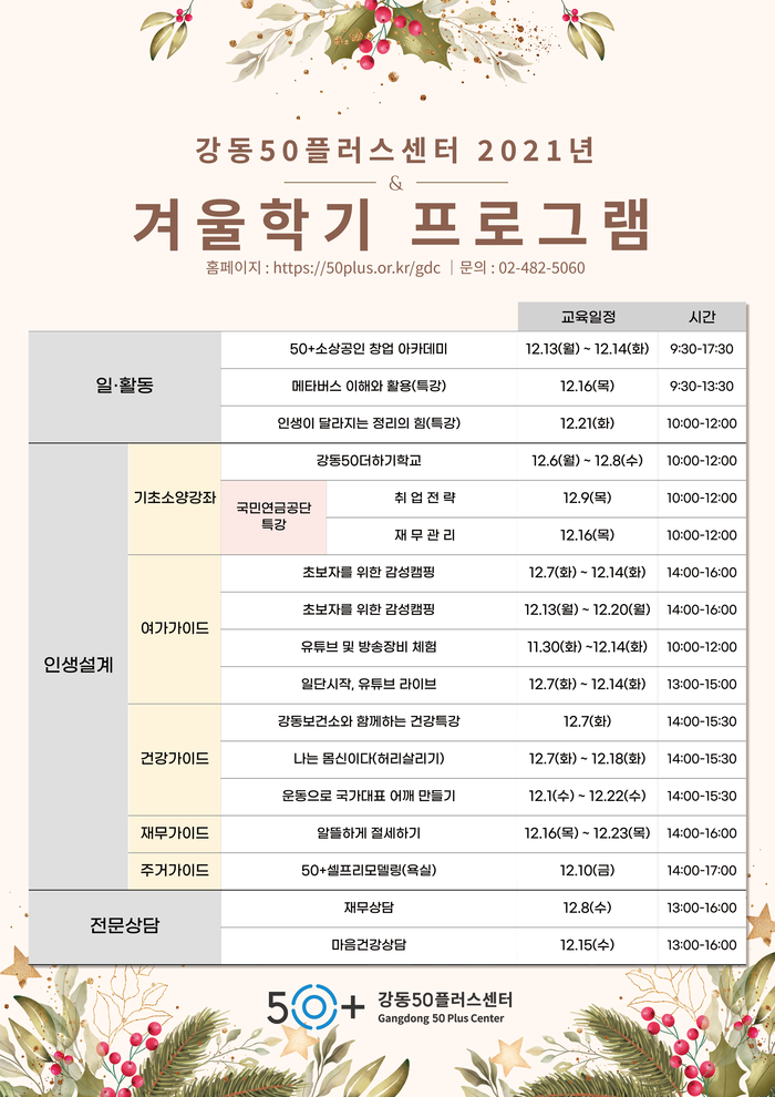 실내 활동이 많아지는 겨울철을 건강하게 보낼 수 있도록 다양한 건강 분야 프로그램도 열린다. 지난 10월 인기리에 진행되었던 캠핑, 유튜브제작 등 재개설 요청이 많았던 프로그램은 앙코르 강의도 진행한다.