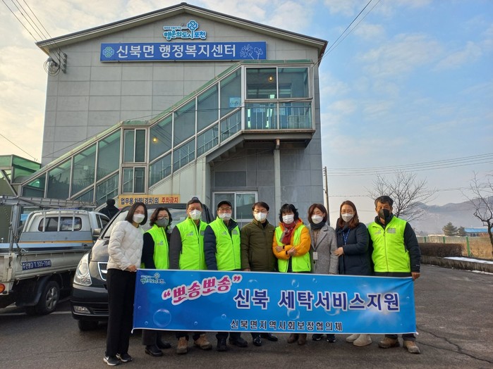 경기 포천시 신북면지역사회보장협의체는 최근 노인 및 장애인 총 10가구에 직접 이불 수거를 하고 세탁 후 집까지 배달하는‘뽀송뽀송 신북세탁지원사업’을 추진했다. 사진은 이날 신북세탁지원사업 봉사자들이 기념촬영을 하는 모습. (사진제공=포천시청)