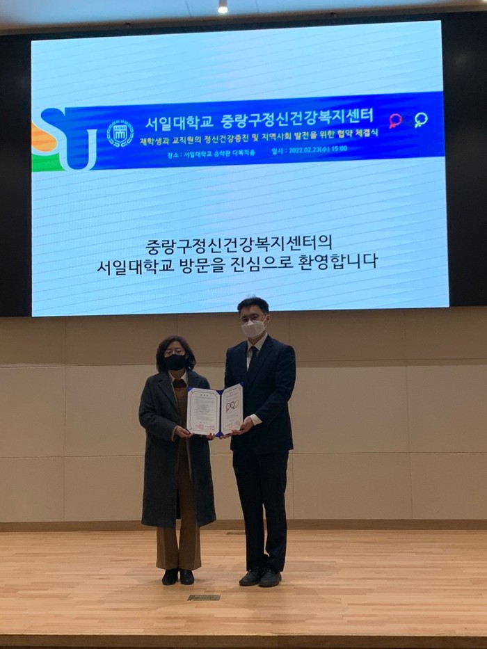 서울 중랑구 정신건강복지센터가 최근 서일대학교와 ‘청년 마음건강을 위한 업무협약’을 체결했다. 이번 협약으로 중랑구 정신건강복지센터는 서일대학교 재학생들을 대상으로 정신건강검진, 자살예방교육, 마음건강 프로그램을 운영할 예정이다. 사진은 협약식에서 관계자들이 기념촬영을 하는 모습. (사진제공=중랑구청)