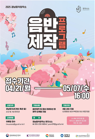 [김해=최성일 기자] 경남음악창작소 ‘뮤지시스’가 도내 뮤지션의 활동 기반 마련과 지역 대중음악산업 활성화를 위해 ‘2025년 음반제작 지원 프로그램’ 참여 뮤지션을 모집한다.