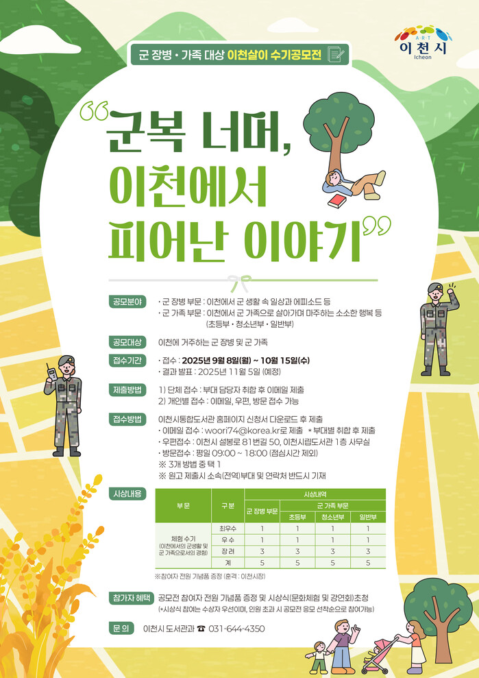 [시민일보 = 민장홍 기자] 경기 이천시 도서관은 군 장병과 그 가족을 대상으로 ‘군복 너머 이천에서 피어난 이야기’라는 주제로 이천살이 수기 공모전을 개최한다.