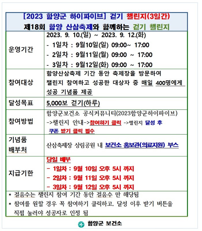 보건소 관계자는 “축제장을 방문하는 방문객들에게 걷기 챌린지 행사를 통하여 걷기 실천의 동기 부여와 소소한 재미를 더하는 행사가 될 것으로 많은 분들이 제18회 함양산삼축제도 즐기고 건강도 챙기는 행사가 되었으면 한다”고 전했다.