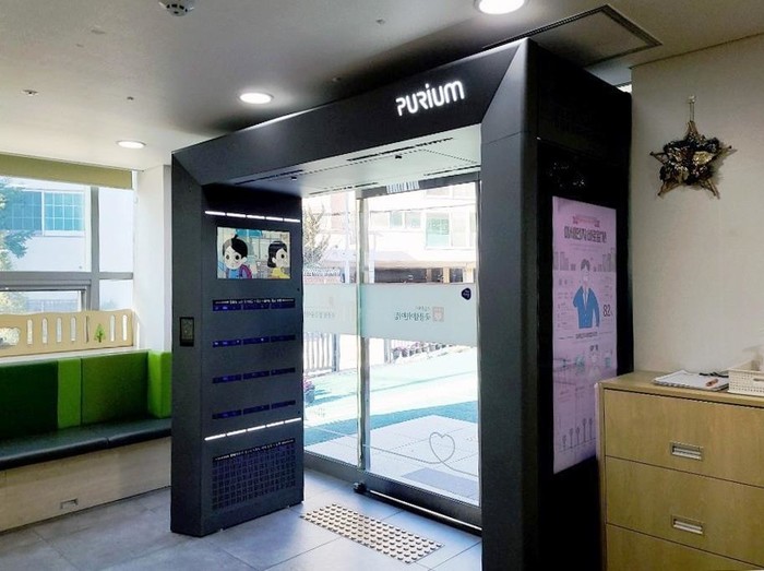 에어샤워기는 너비 1.9m, 높이 2.4m 게이트 형태로 사람이 오가면 이를 자동으로 인식, 강한 바람을 내보내 미세먼지를 제거하고 탈취를 돕는다.
