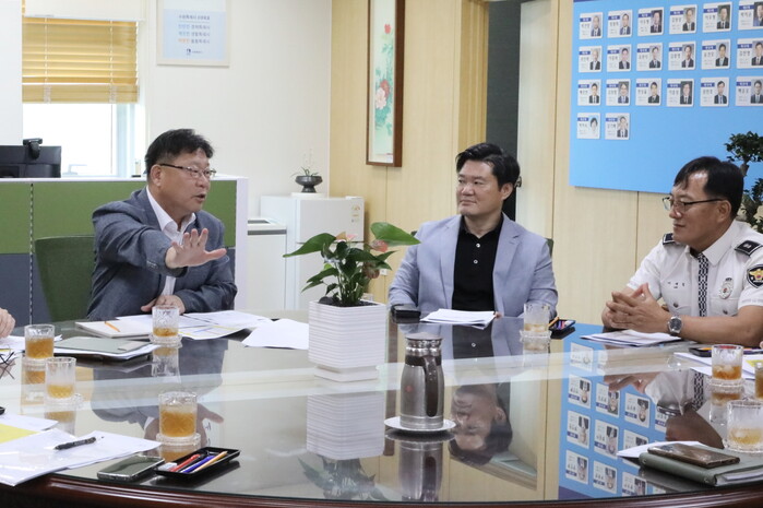 경기 수원시 팔달구는 24일 구청장실에서 수원중부경찰서, 수원서부경찰서, 수원시 도시안전통합센터가 참석한 가운데 교통체계 개선을 위한 유관기관 간담회를 진행했다. 사진은 이상균 구청장(왼쪽)이 발언하고 있는 모습. (사진=팔달구청 제공)