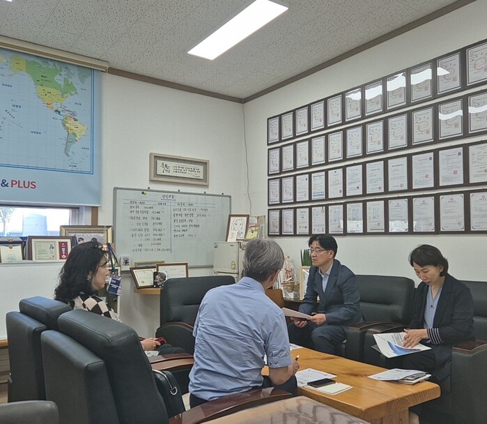 경기 김포시는 지난 6일 양촌읍에 위치한 LED조명 생산 전문기업 (주)효성앤플러스를 방문해 기업현황 및 애로사항을 청취했다. 사진은 김규식 부시장(오른쪽 두 번째)과 경제국장 및 회사 관계자들이 대화를 나누고 있는 모습. (사진=김포시청 제공)