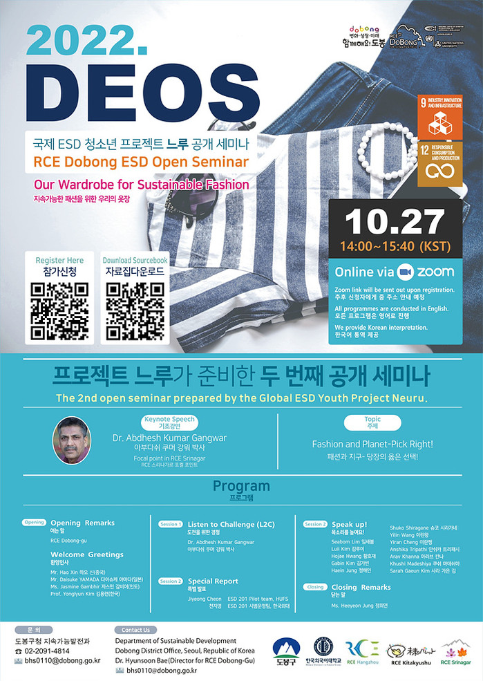 또한 ▲RCE 스리나가르(인도)의 아부다쉬 쿠머 강워 박사의 ‘패션과 지구-당장의 옳은 선택!’ 기조강연 ▲도봉구-유네스코한구위원회-한국외대 공동 연구 ‘ESD 과정 개발 운영’의 지역연계형 ESD 파일럿팀 특별발표 ▲‘지속가능한 패션을 위한 우리의 옷장’에 대한 느루 참여 학생 12명의 ‘목소리를 높여요!(Speak Up!)’ 등이 진행된다.