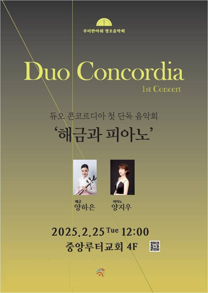 한국루터란아워는 오는 25일 12시 듀오 콘코르디아(Duo Concordia)를 초청해 피아노와 성악을 주제로 지역 주민과 교인을 대상으로 하는 정오음악회를 중앙루터교회 본관 4층에서 개최한다고 밝혔다.