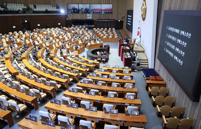 이런 가운데 국민의힘 의원들은 이날 오전 본회의 불참에 이어 본회의장 앞 로텐더홀에서 규탄대회를 여는 등 야당의 일방적인 탄핵소추안 강행 처리에 항의했다.