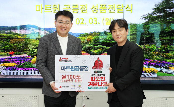 오승록 노원구청장이 3일 구청장실에서 ‘마트원 공릉점 따뜻한 겨울나기 기부 전달식’을 열고, 기부 관계자들을 격려했다. 사진은 오 구청장(왼쪽)이 기념촬영을 하는 모습. (사진=노원구청 제공)